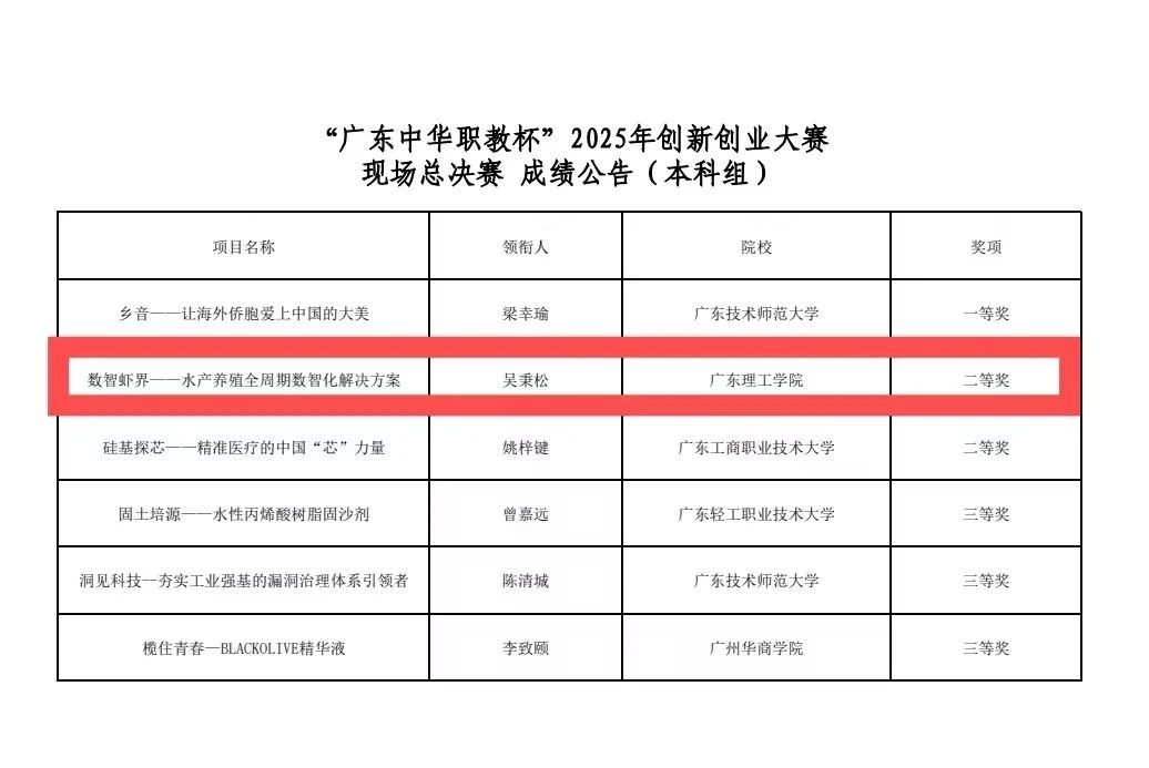 11月22日,由广东中华职业教育社主办的2025年“广东中华职教杯”创新创业大赛评审结果揭晓。全省院校积极组织学生参赛,众多优秀项目在层层筛选后进入总决赛。在激烈竞争中,由舒程、刘建友、王丹、周景报、方中健五位指导老师悉心指导的tyc太阳成9728集团团队,凭借《数智虾界——水产养殖全周期数智化解决方案》在总决赛中脱颖而出,荣获总决赛(本科组)二等奖。该方案聚焦水产养殖行业痛点,以数智化为核心提出全周期解决方案,实用性与前瞻性兼备。