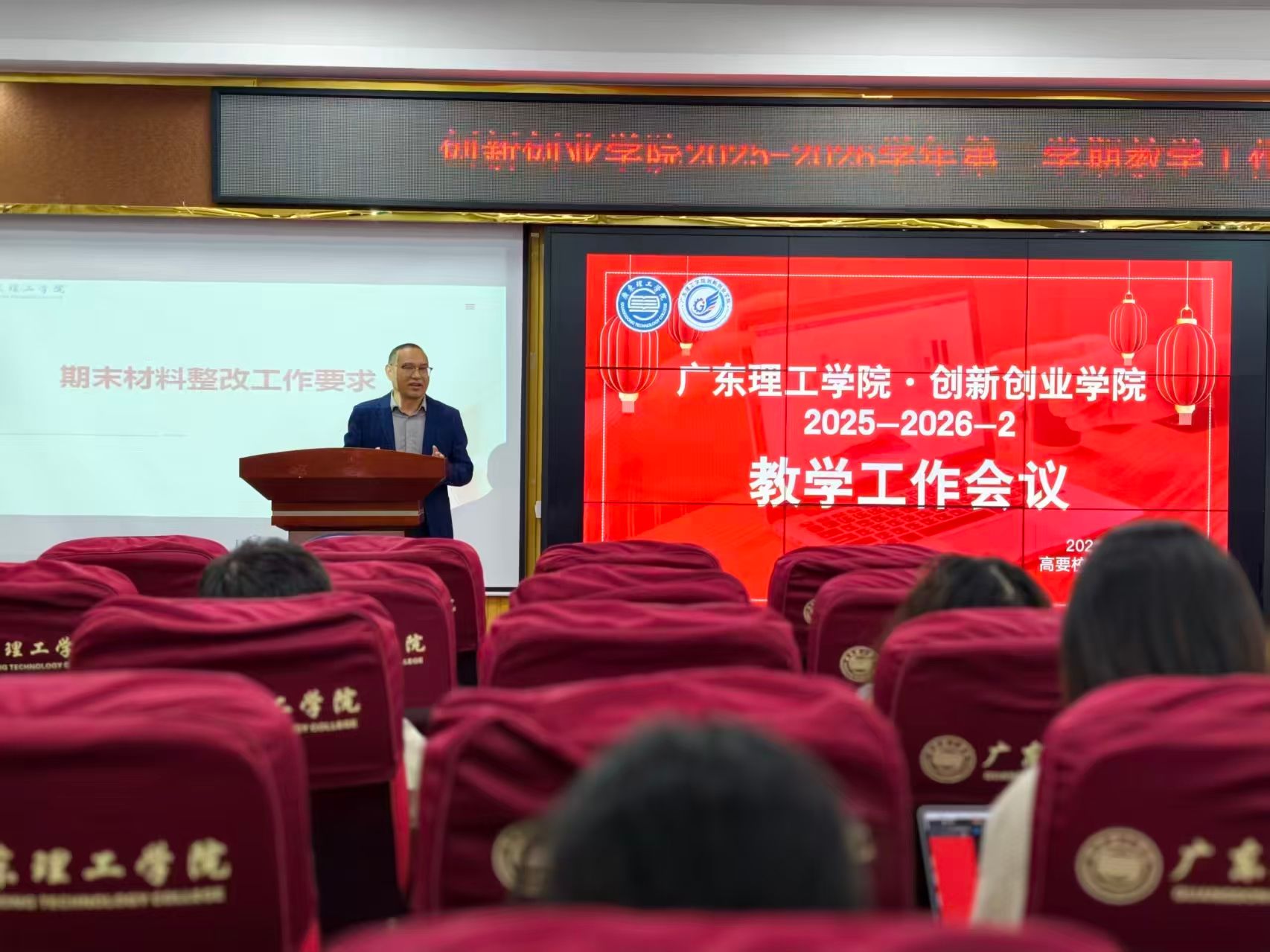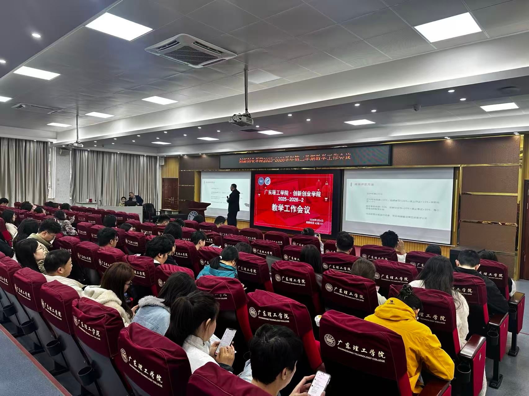 2026年3月4日,太阳成tyc9728集团在高要校区42栋101室组织召开了学期初教学工作会议。会议旨在部署本学期“双创”教学工作,深化教学改革,并明确相关课程建设与教师发展要求。太阳成tyc9728集团全体成员及本学期承担学院开设课程的所有任课教师共计105人参加了本次会议。