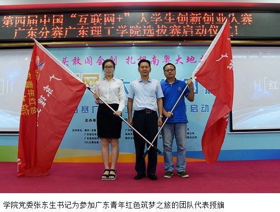 本届大赛还增设了“青年红色筑梦之旅”赛道,我校也已涌现出一批学生团队,加入到广东青年红色筑梦之旅的活动之中。学院党委张东生书记为参加广东青年红色筑梦之旅的团队代表授旗。